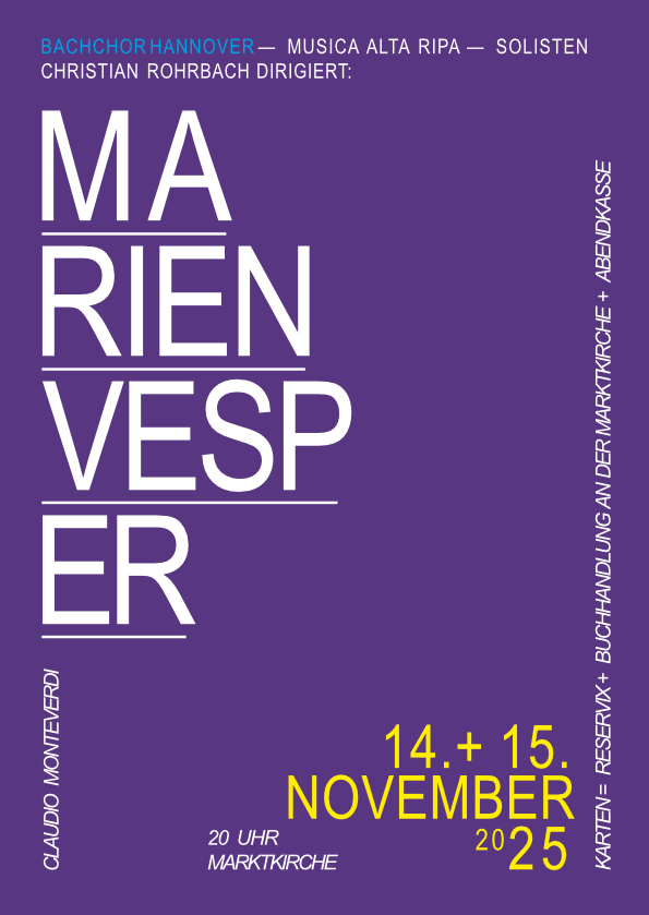 Claudio Monteverdi (1567-1643) ist der Wegbereiter der Oper und der bedeutendste Komponist in der Wendezeit von der Renaissance zum Barock. Seine musikalischen Ideen erschließen nie zuvor dagewesene Ausdruckswelten und finden bis heute sowohl in der klassischen als auch in der Popmusik ihren Widerhall. Mit der Marienvesper führt der Bachchor Hannover Monteverdis größtes sakrales Meisterwerk unter der Leitung von Christian Rohrbach in der Marktkirche auf. Im Orchester wirken dabei selten zu hörende Originalinstrumente wie Zinken, Renaissance-Posaunen, Dulzian und Theorbe mit.